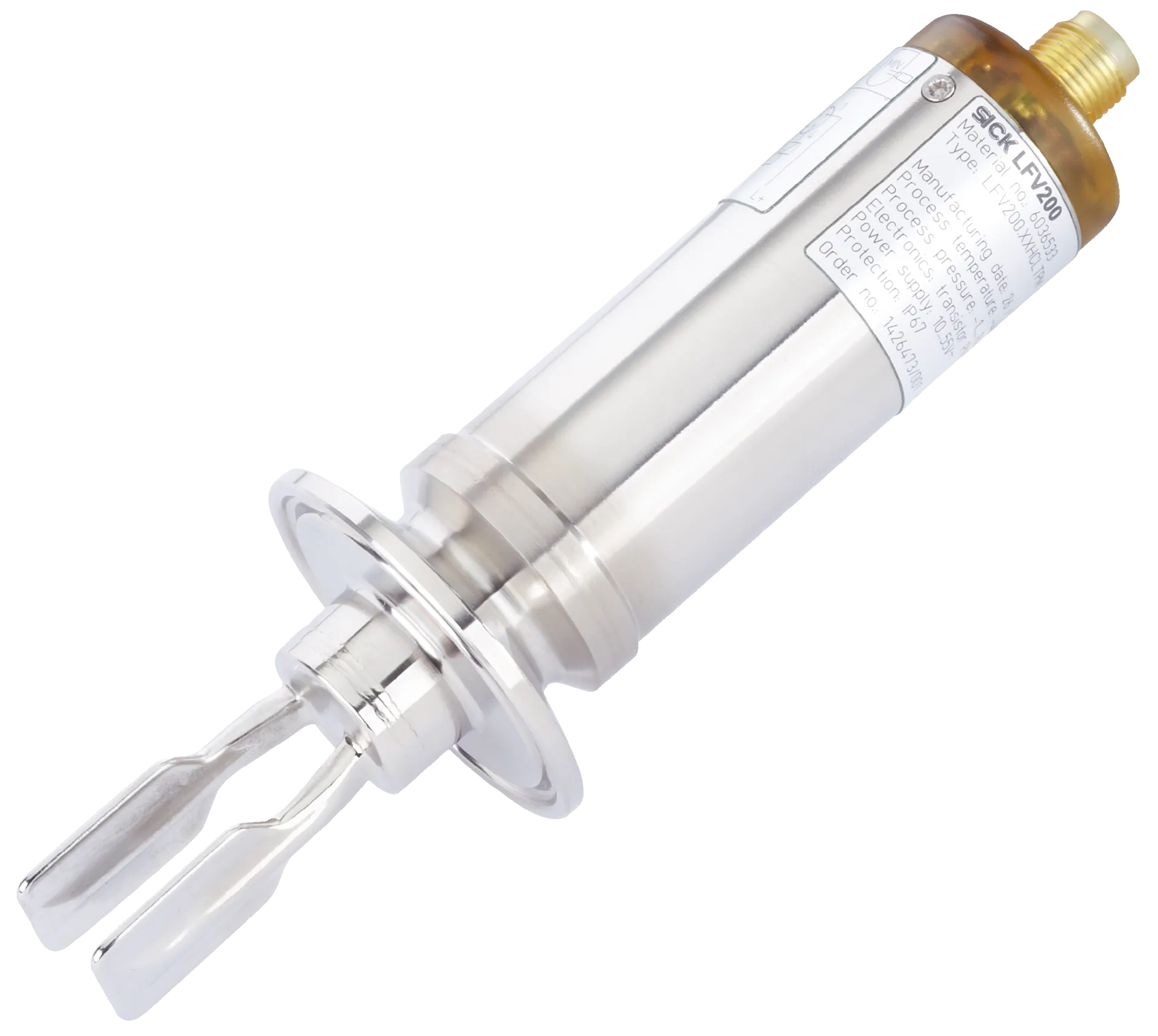 Level sensors | LFV200 | LFV200-XXHRLIPM | Communication interface: IO-Link | Process connection: Conical coupling DN 25 acc. to DIN 11851 withUnion nut (PN 40, 316L, Ra < 0.8µm) | Probe length: 67 mm | Probe type: Tuning fork | Remote amplifier: No | Output signal: Transistor output PNP with IO-Link | Connection type: M12 round connector x 1, 4-pin | Process temperature: –40 °C … +150 °C | Process pressure: –1 bar … 64 bar | Wetted parts: Stainless steel 1.4404 / 316L | Housing material: Stainless steel 1.4404 / 316L, PEI | Enclosure rating: IP67 | Display: no | PWIS-cleaned: no | Bluetooth: no