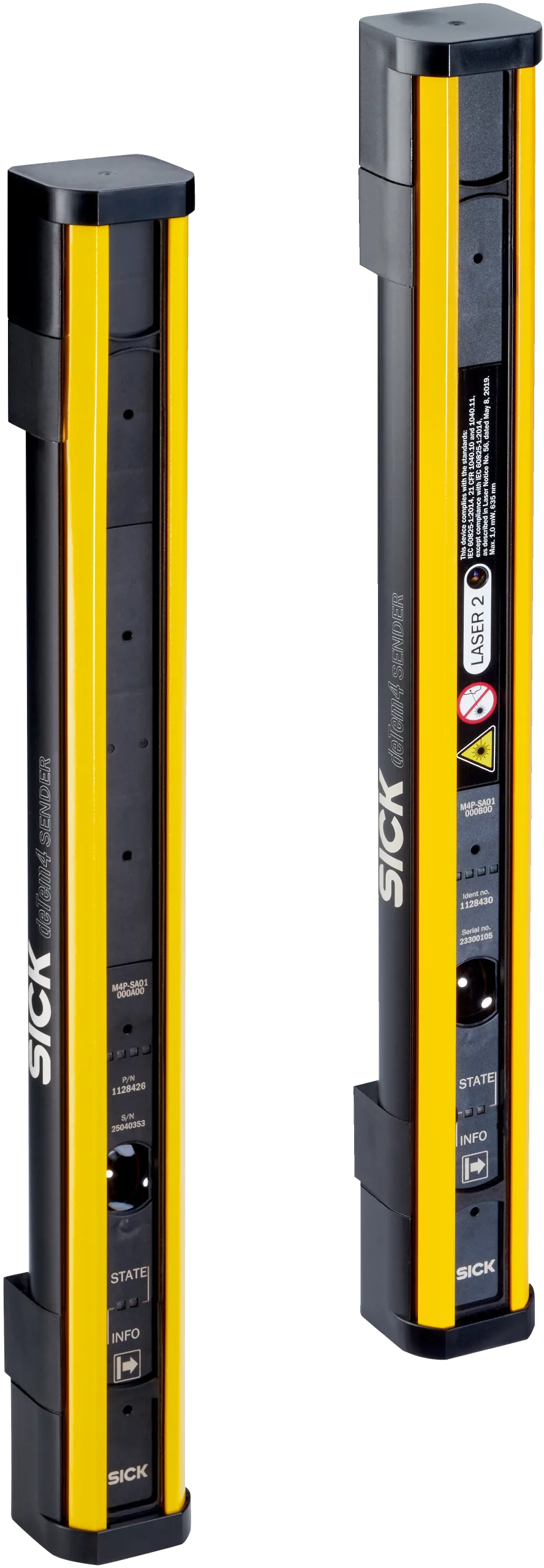 Safety light-beam sensors | deTem | M4P-SA01000B00, M4P-EA01000C00 | Product version: deTem4 | Functional principle: Sender/receiver | System part: Pair | Application: Normal industrial environment | Safety level: PL e, SIL 3, Type 4 | Functions: Protective operation, beam coding, restart interlock, external device monitoring (EDM), Differentiation between person and material | Scanning range: 90 m | Number of beams: 1 | Connection type: Depending on system plug (M12 male connector, 5-pin or 8-pin) | Extension connection: Depending on system plug (without extension connection or with M12 female connector, 5-pin) | End cap with integrated LED: no | Integrated laser alignment aid: yes | Enclosure rating: IP65, IP67 | Items supplied: Sender, receiver, safety instruction, Mounting instructions, Operating instructions for download