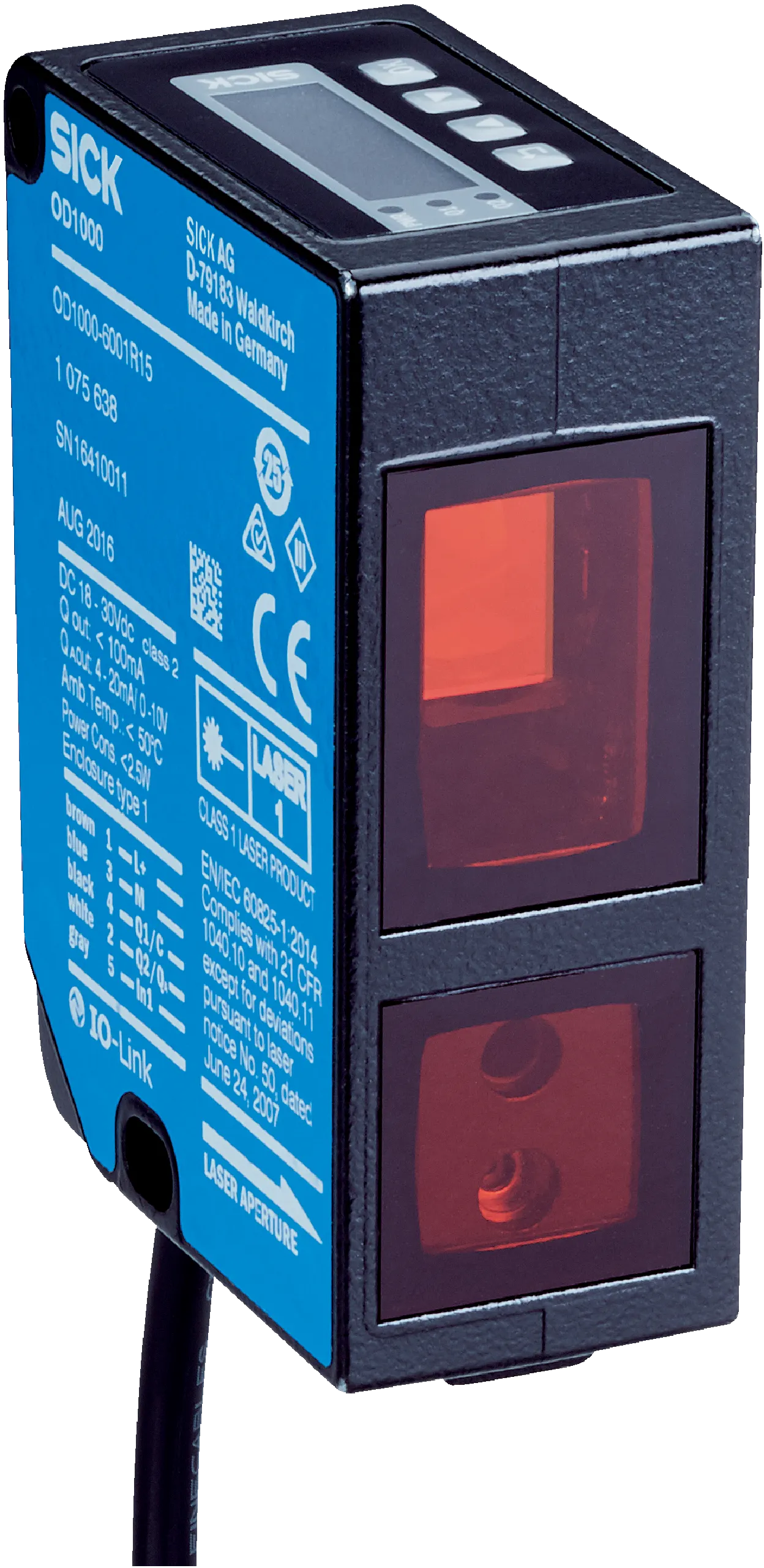 Laser distance sensors | OD1000 | OD1000-6001R15 | Communication interface: IO-Link | Digital output: 2 x push-pull: PNP/NPN | Type of analog output: Current output / voltage output | Measuring range: 200 mm … 1,000 mm | Linearity: ± 1,500 µm | Laser class: 1 | Typ. light spot size (distance): 1.5 mm x 1.5 mm (200 mm … 1,000 mm) | Housing material: Metal | Connection type: Cable with male connector, M12, 5-pin, A-coded, 30 cm