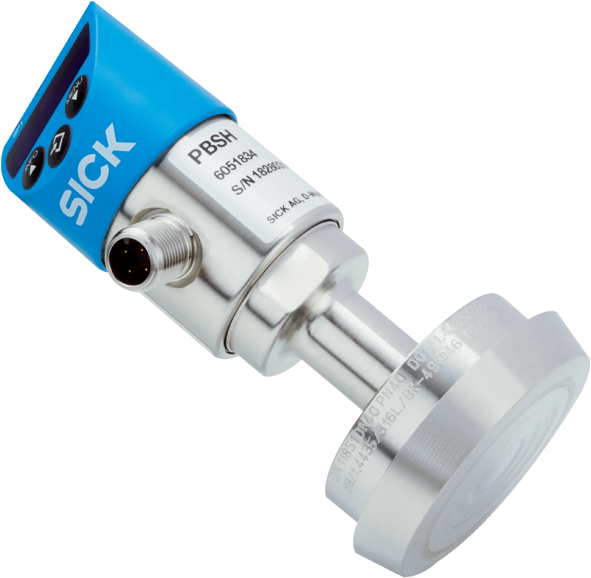 Pressure sensors | PBS Hygienic | PBSH-RB1X0S54S0NMA0Z | Pressure type: Gauge pressure | Pressure unit: bar | Measuring range: 0 bar … 1 bar | Accuracy: ≤ ± 1 %, of the span (including non-linearity, hysteresis, zero point and full scale error (corresponds to error of measurement as per IEC 61298-2)) | Process connection: Conical coupling (DIN 11851) DN 40 with union nut | Process temperature: –20 °C … +100 °C | Seal: Without seal | Communication interface: IO-Link | Output signal: IO-Link/PNP + 4 mA … 20 mA | Connection type: M12 round connector x 1, 4-pin, IP65, IP67 | Supply voltage: 15 V DC … 35 V DC
