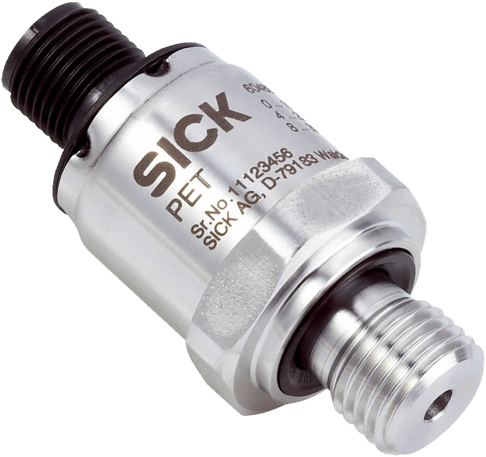 Pressure sensors | PET | PET-1CB010G80SAMA | Pressure type: Compound pressure | Pressure unit: bar | Measuring range: –1 bar … 9 bar | Accuracy: ≤ ± 1.2 %, of span (at room temperature) | Process connection: G ⅛ B (EN 837) | Pressure port: Standard | Process temperature: –30 °C … +100 °C | Seal: Without seal | Communication interface: – | Output signal: 4 mA … 20 mA, 2-wire | Connection type: M12 round connector x 1, 4-pin, IP67 | Supply voltage: 8 V DC … 30 V DC | Pieces per package: 50 pieces