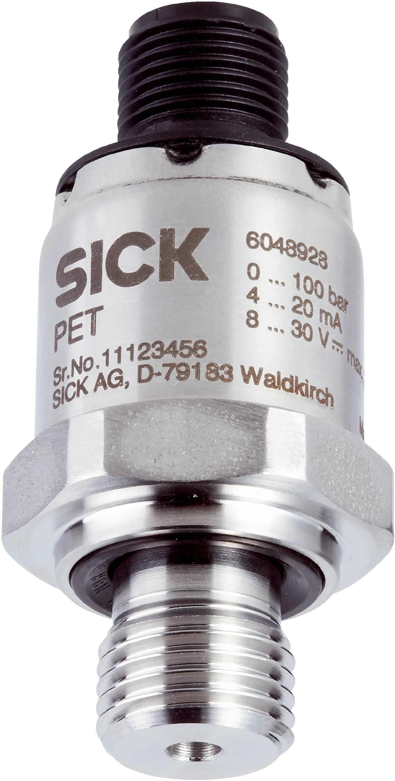Pressure sensors | PET | PET-1RB400G1FSAMA | Pressure type: Gauge pressure | Pressure unit: bar | Measuring range: 0 bar … 400 bar | Accuracy: ≤ ± 1.2 %, of span (at room temperature) | Process connection: G ¼ A (ISO 1179-2) | Pressure port: Standard | Process temperature: –30 °C … +100 °C | Seal: FKM | Communication interface: – | Output signal: 4 mA … 20 mA, 2-wire | Connection type: M12 round connector x 1, 4-pin, IP67 | Supply voltage: 8 V DC … 30 V DC | Pieces per package: 50 pieces