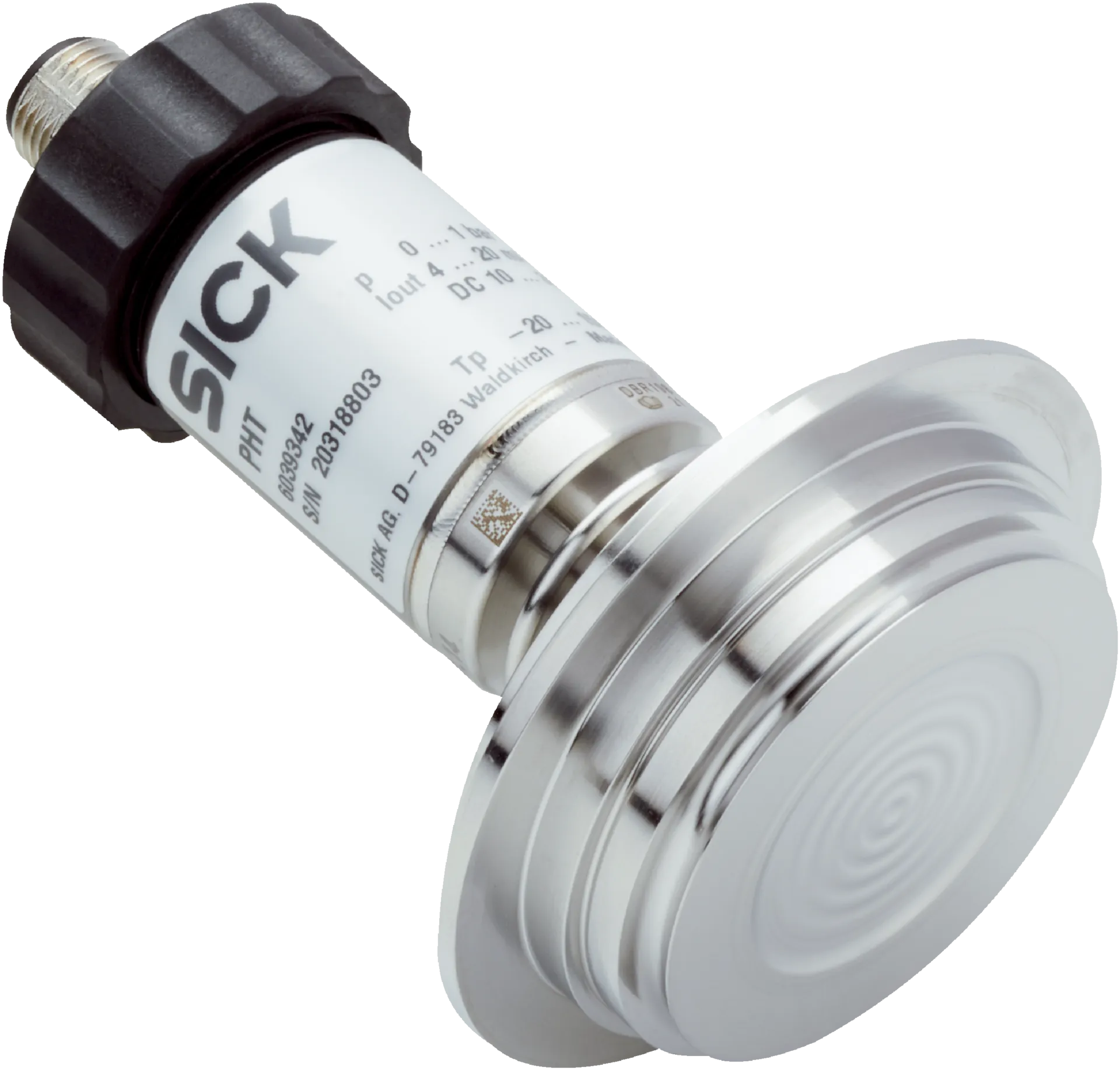 Pressure sensors | PHT | PHT-RB010SVF0S0AFT0Z | Pressure type: Gauge pressure | Pressure unit: bar | Measuring range: 0 bar … 10 bar | Accuracy: ≤ ± 0.5 %, of the span (optional 0.25 % of span (adjusted in vertical mounting position with lower pressure connection)) | Process connection: Varivent connection type F | Process temperature: –20 °C … +150 °C | Seal: Without seal | Communication interface: – | Output signal: 4 mA … 20 mA, 2-wire | Connection type: Field housing, IP67 | Supply voltage: 11 V DC … 30 V DC