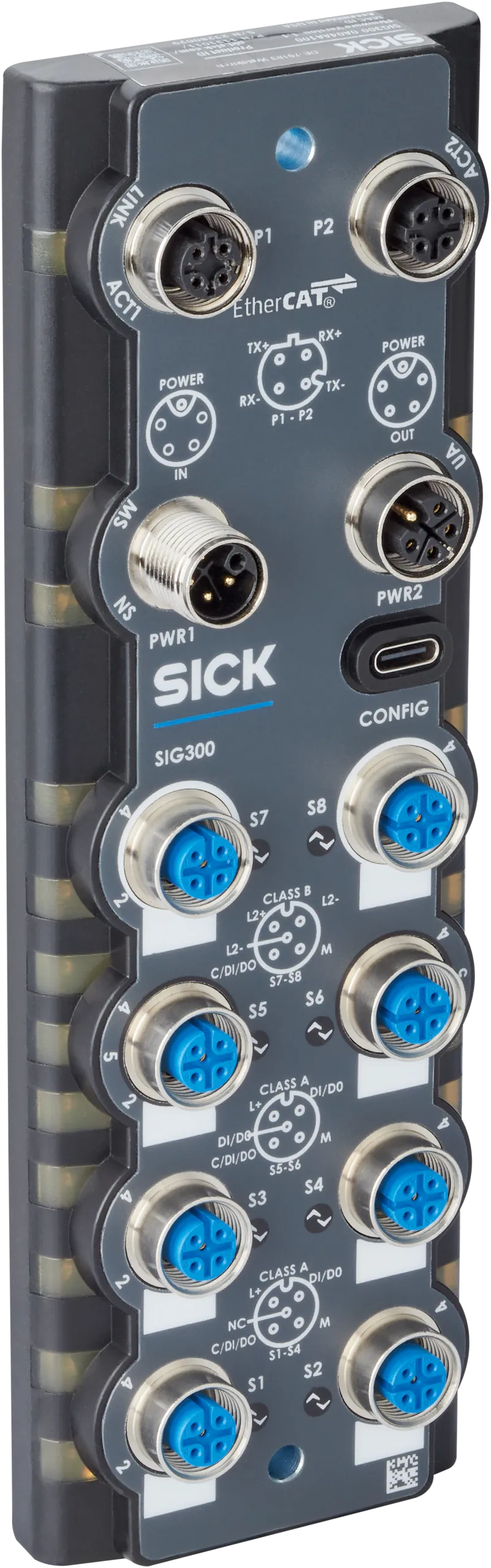 Network devices | SIG300 | SIG300-0A06AA100 | Product category: IO-Link Master | Communication interface: IO-Link, REST API, Ethernet, EtherCAT® | Supported products: IO-Link Devices, binary switching sensors, binary actuators | Scope of delivery: SIG300, safety instruction, Blind plugs (9 x M12, 1 x USB-C) | Further functions: Web server integrated, IIoT interface available