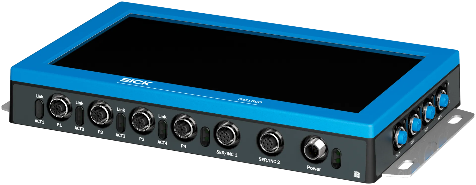 Edge computing devices | SM1000 | SM1000-R222100 | Product category: Programmable devices, IO-Link Master | Supported products: IO-Link Devices, binary switching sensors, binary actuators | Processor: TI SITARA AM6421 | Display size: 10.1 ″ | Application development kit: SICK AppStudio, Can be programmed within the SICK AppSpace environment | Connection types: IO-Link4 x M12, 5-pin female connector, A-coded, Ethernet4 x M12, 4-pin socket, D-coded, Serial/INC2 x M12, 8-pin socket, A-coded, Power supply1 x M12, 4-pin plug, A-coded, USB-C1 x USB-C 2.0 | Enclosure rating: IP54 | Communication interface: IO-Link, Ethernet, USB, Serial, REST API, MQTT
