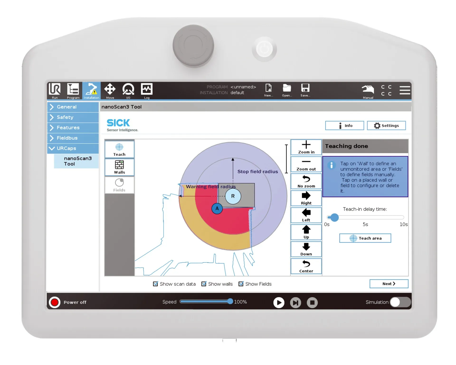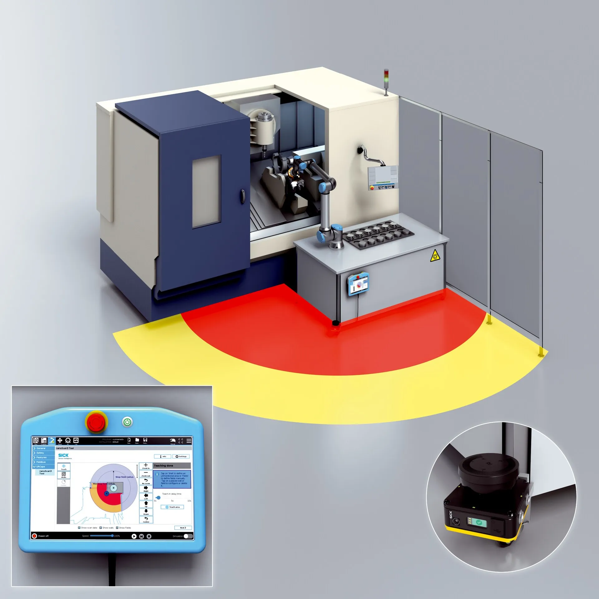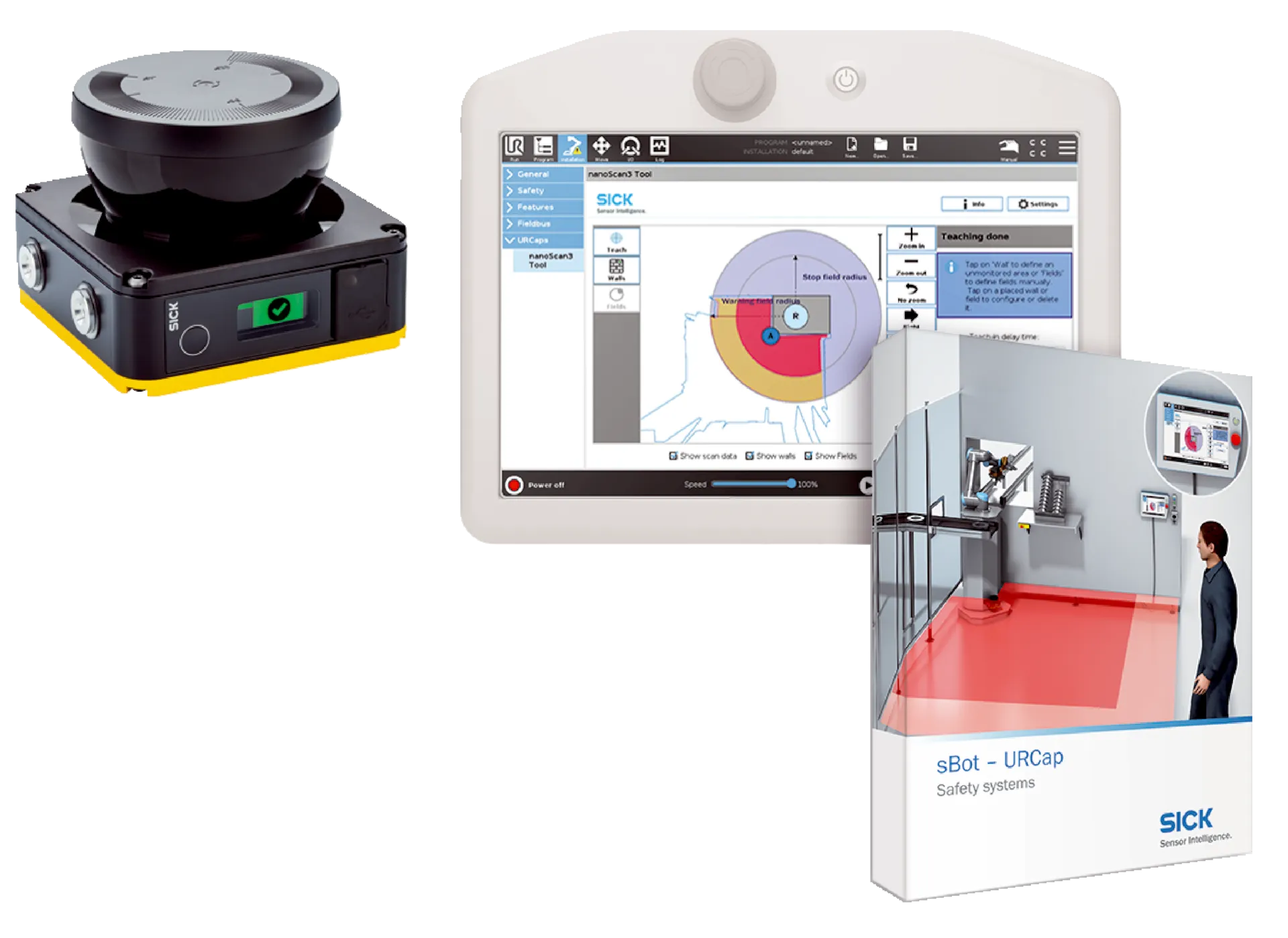 | Description | sBot Stop - URCap is a safety system for UR robots that makes it easy to protect your freely accessible robot application. The system ensures a safe stop with automatic restart of the robot. The nanoScan3 safety laser scanner is used to detect an approaching person. Using the nanoScan3 Tool - URCap, the safety laser scanner can be configured quickly and easily directly via the teach pendant of the robot. |