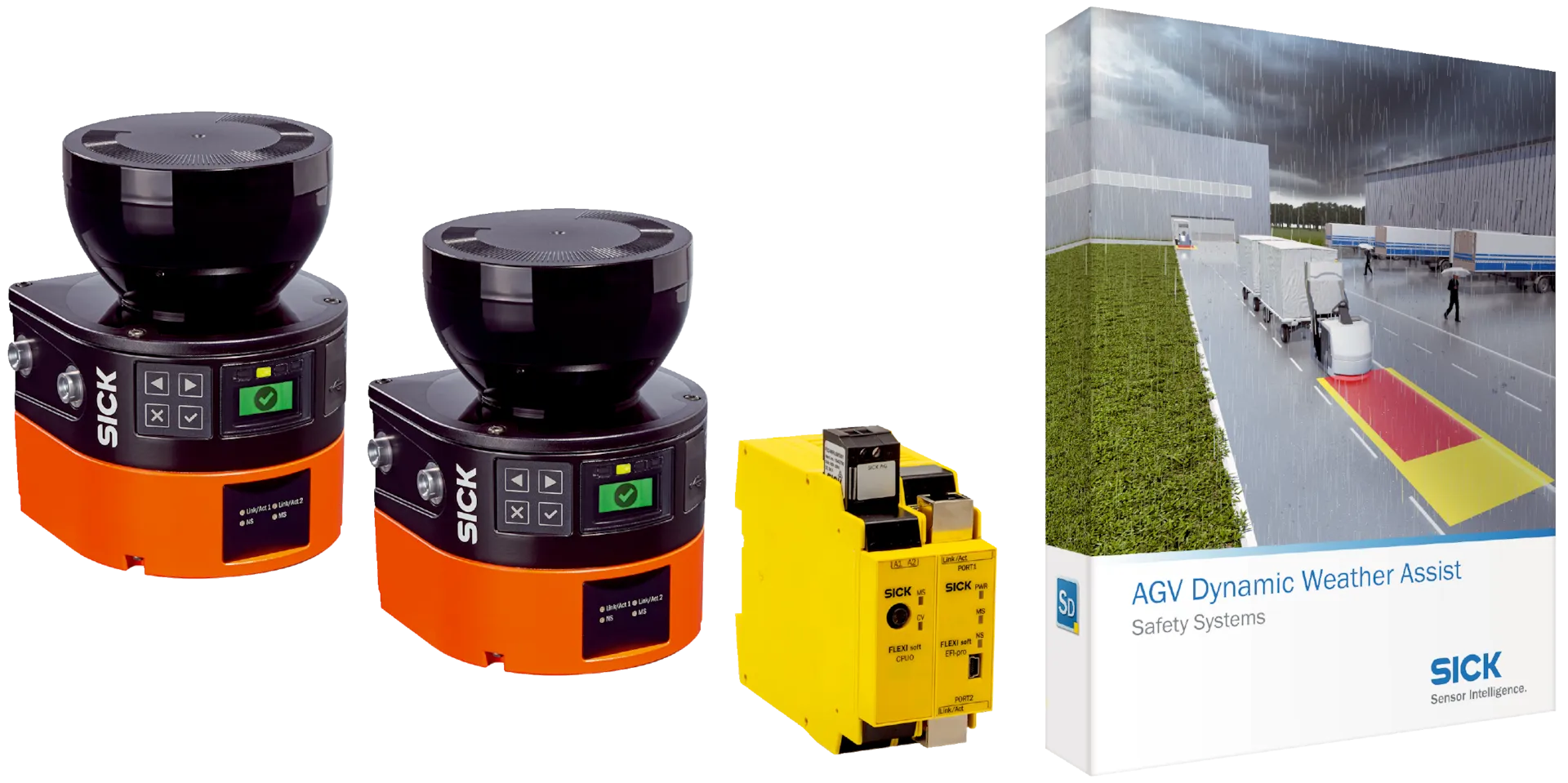 Safety systems for outdoor automation | AGV Dynamic Weather Assist | SYS/DWA-FX004020102OS3 | Product type: Hardware and software | Items supplied: 2x outdoorScan3 Pro EIP safety laser scanner, FX3-CPU0 Flexi Soft main module, FX3-MPL0 Flexi Soft system plug, EFI-Pro FX3-GEPR0 Flexi Soft gateway, documentation (operating instructions), Software (Safety Designer project file with functional logic) as well as operating instructions