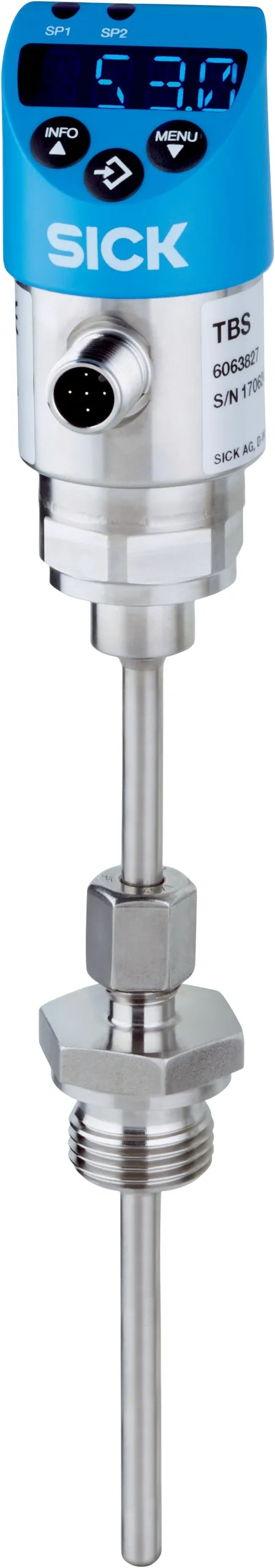 Temperature sensors | TBS | TBS-1DxS41506CE | Temperature measuring range: –20 °C … +120 °C | Process connection: Compression fitting G ¼ A | Insertion length/diameter of probe: 150 mm / 6 mm | Seal: Copper | Output signal: IO-Link/PNP + PNP + 4 mA … 20 mA | Connection type: Round connector M12 x 1, 5-pin | Enclosure rating: IP65, IP67 | Communication interface: IO-Link