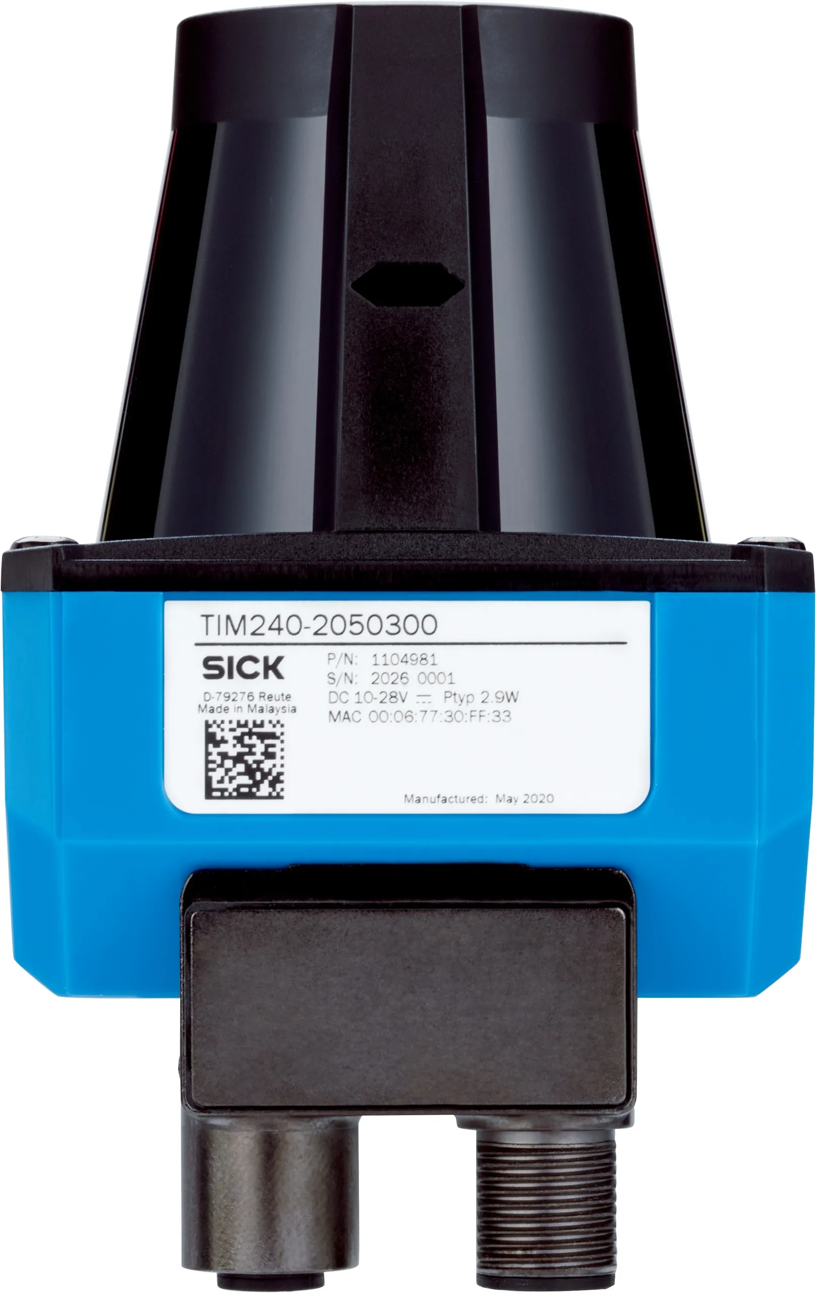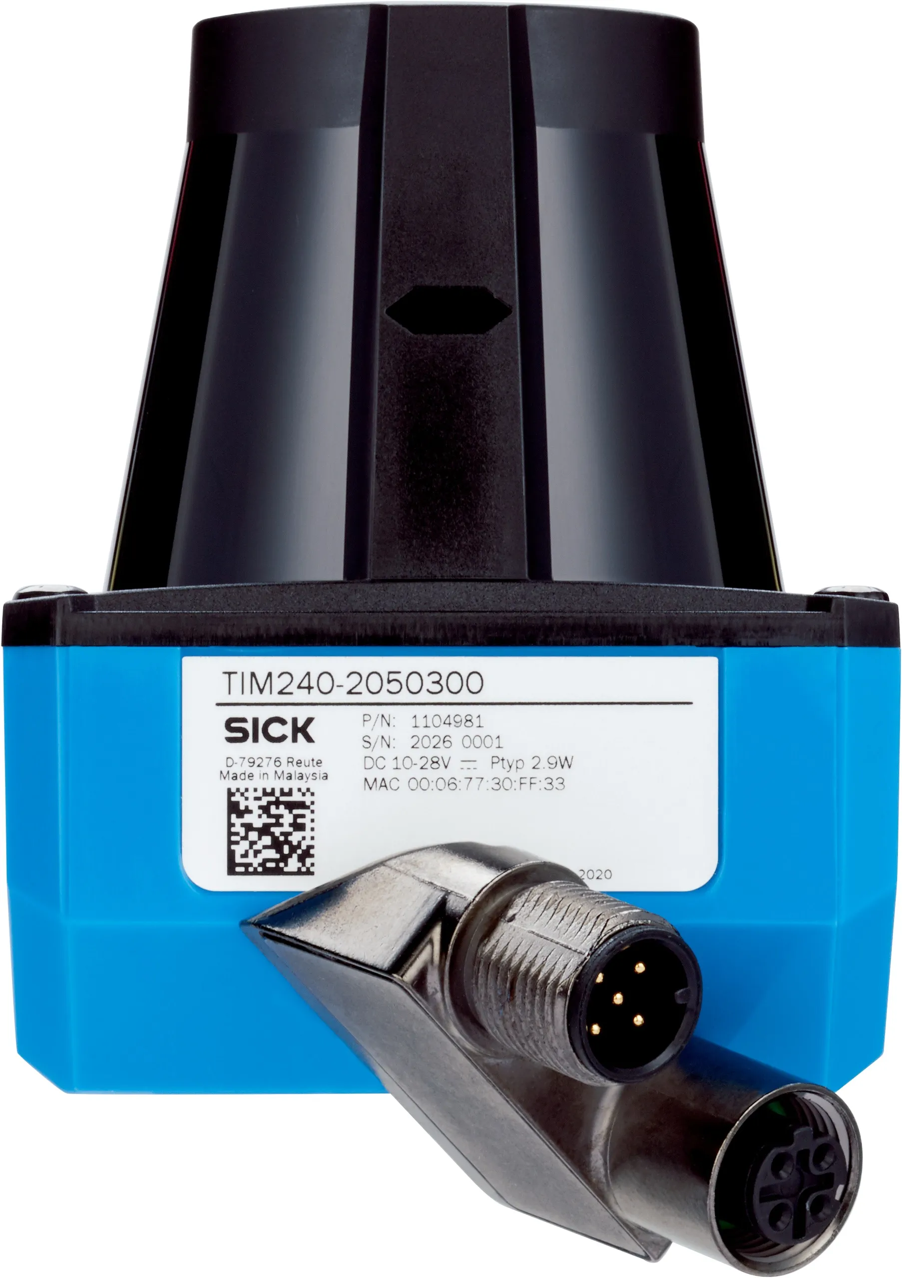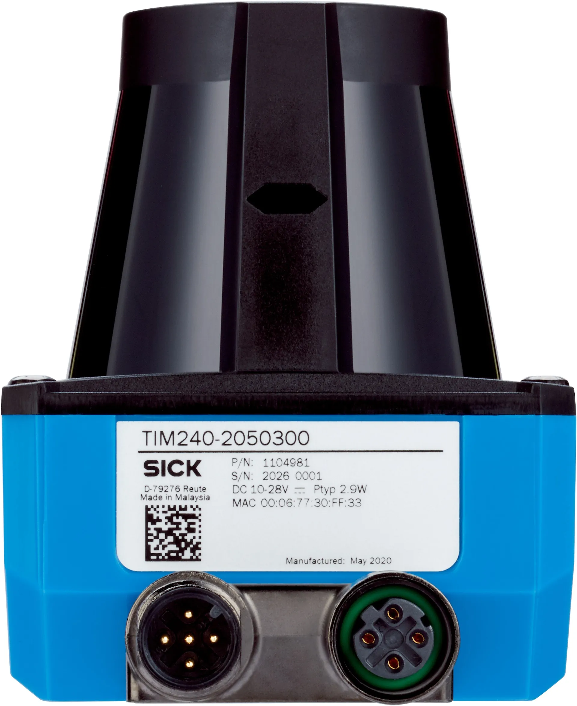 LiDAR sensors | TiM | TiM240-2050300 | Integrated application: Output of measurement data | Measurement principle: HDDM+ | Working range: 0.05 m … 10 m | Enclosure rating: IP65 | Digital outputs: 1 (Push-pull, “Device Ready”) | Connection type: 1 x “Ethernet” connection, 4-pin M12 female connector, 1 x connection “Power”, 5-pin, M12 male connector