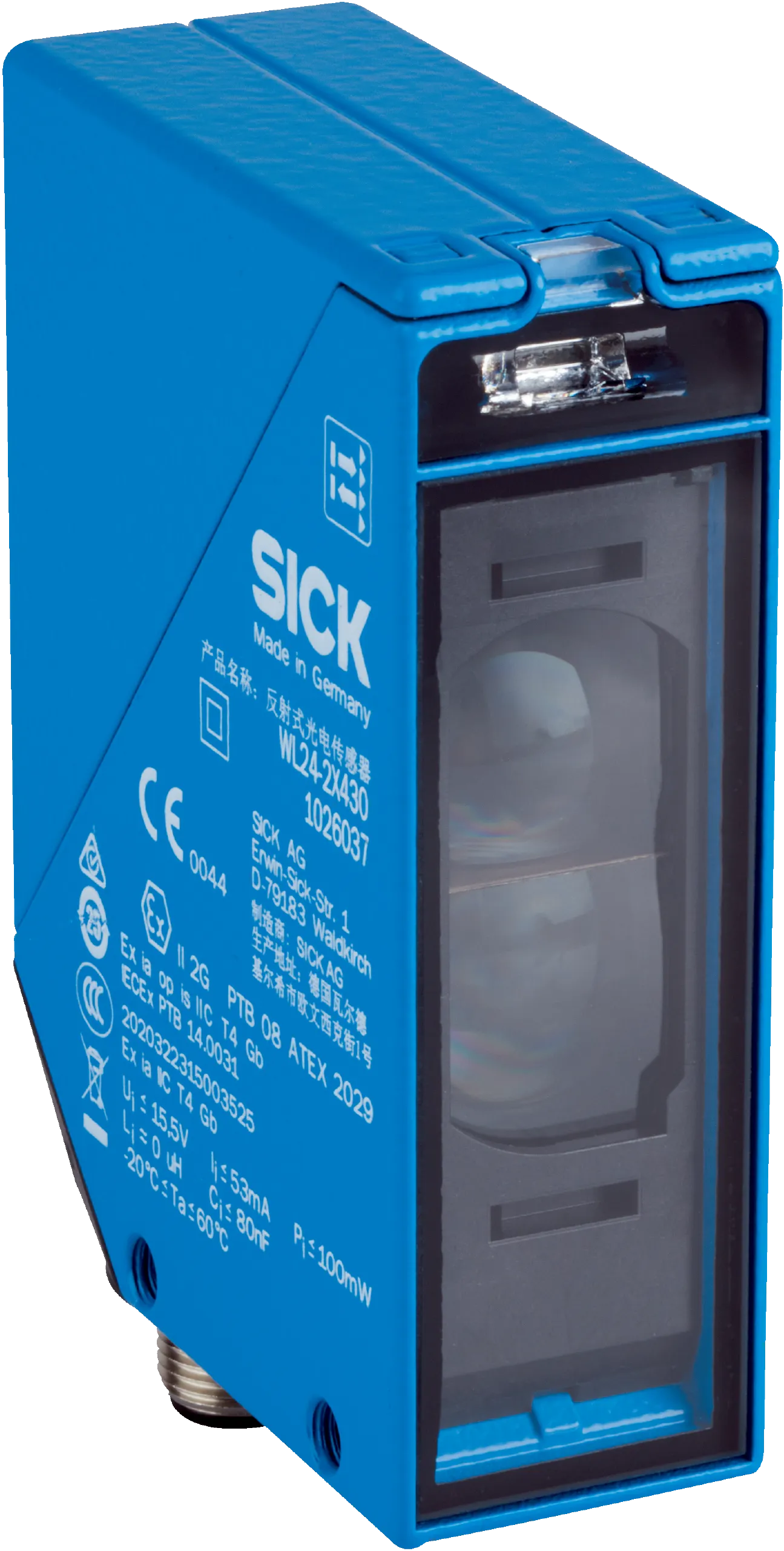 Photoelectric sensors | W24 | WL24-2X230 | Sensing range max.: 0 m … 22 m | Functional principle: Photoelectric retro-reflective sensor | Switching output: NAMUR | Switching mode: Light switching | Connection type: Terminal connection with M16 gland | Adjustment: Potentiometer | Info: ATEX II 2G Ex ia op is IIC T4 Gb according to directive 2014/34/EU PTB 08 ATEX 2029 In the framework of directive 2014/34 / EU (ATEX) and DIN EN ISO/IEC 80079-34, we would like to point out that the traceability of the ordered device to your customer is your responsibility (documentation of your customer and associated product data, such as part number, datcode, serial number)