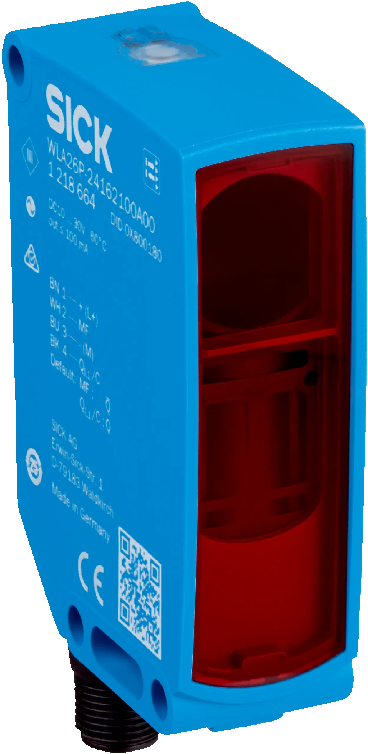 Photoelectric sensors | W26 | WLA26P-24116100ZZZ | Sensing range min. / max.: 0 m / 18 m | Functional principle: Photoelectric retro-reflective sensor | Functional principle detail: Without reflector minimum distance (autocollimation/coaxial optics) | Switching output: Push-pull: PNP/NPN | Switching mode: Light switching | Connection type: Male connector M12, 4-pin | Light source: PinPoint LED | Type of light: Visible red light | Housing material: VISTAL® | Adjustment: None | Housing: Rectangular