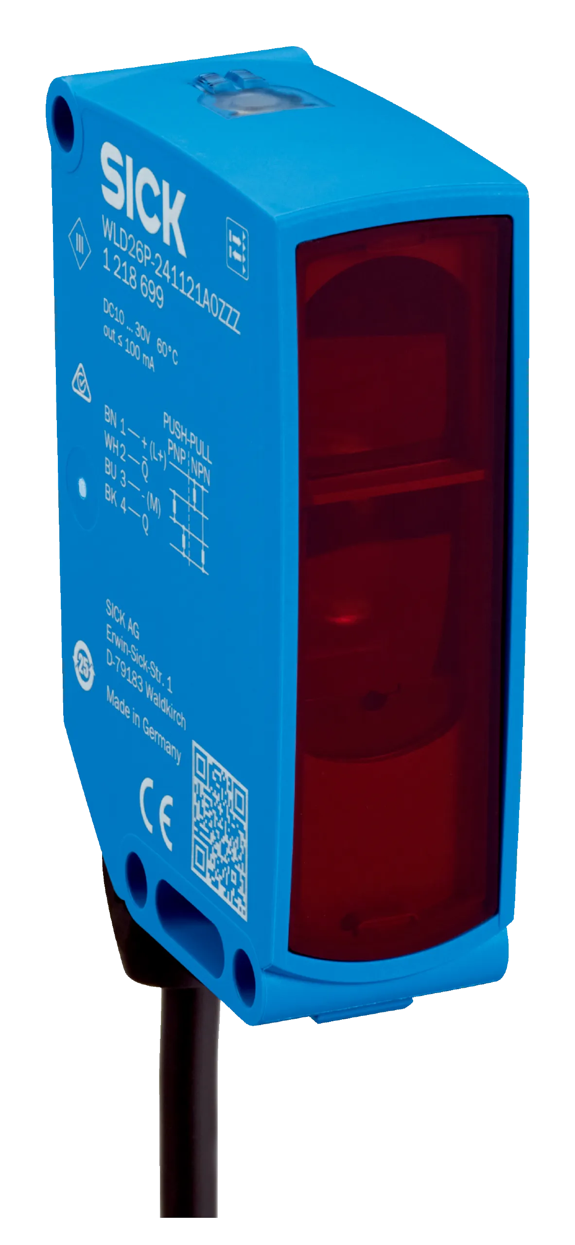 Photoelectric sensors | W26 | WLD26P-1H1121A0ZZZ | Sensing range min. / max.: 0.25 m / 19 m | Functional principle: Photoelectric retro-reflective sensor | Functional principle detail: With minimum distance to reflector (dual lens system) | Switching output: Push-pull: PNP/NPN | Switching mode: Light/dark switching | Connection type: Cable, 4-wire, 2 m | Light source: PinPoint LED | Type of light: Visible red light | Housing material: VISTAL® | Adjustment: None | Housing: Rectangular