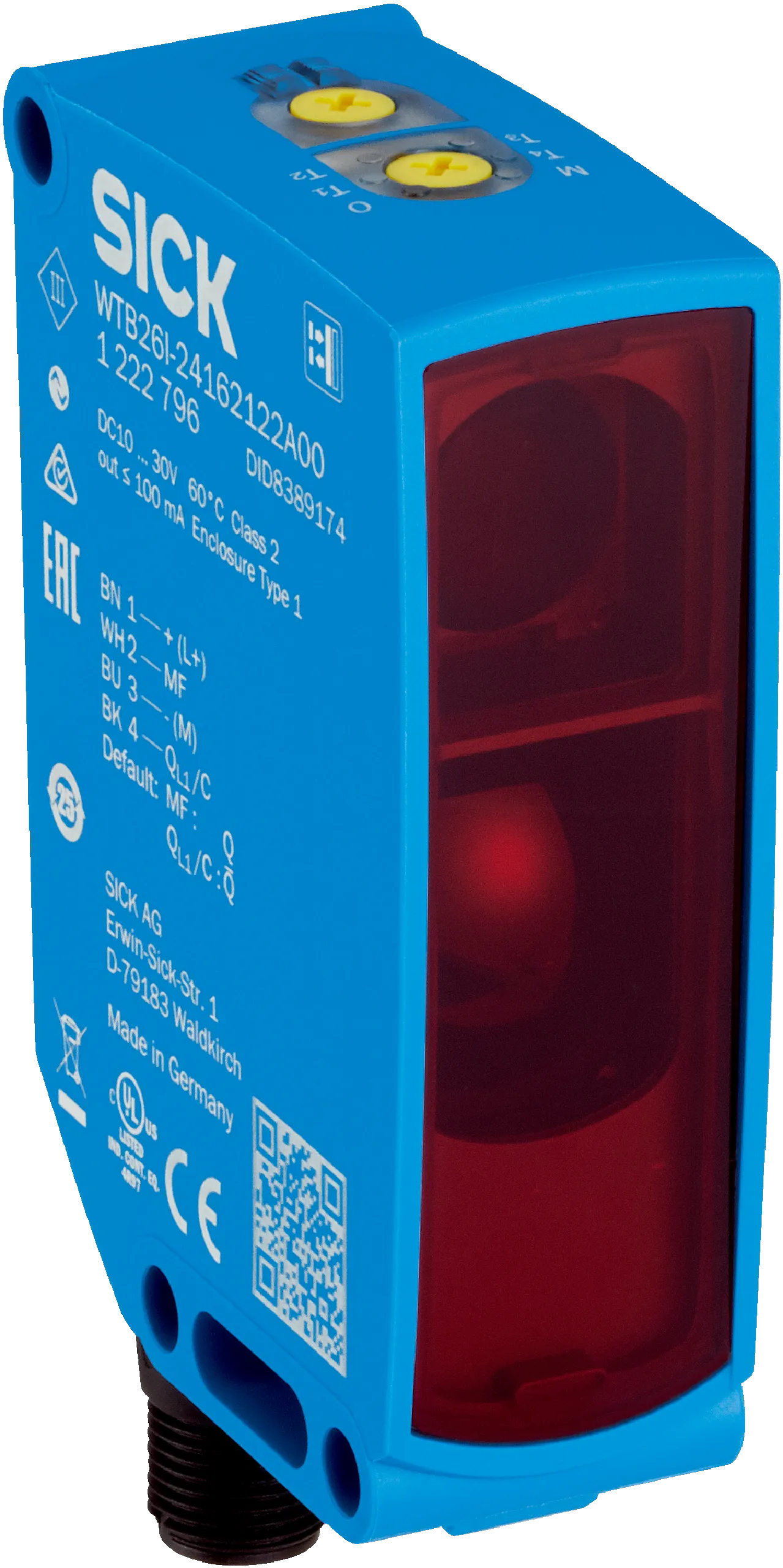 Photoelectric sensors | W26 | WTB26I-24161422A00 | Sensing range min. / max.: 30 mm / 3,000 mm | Functional principle: Photoelectric proximity sensor | Functional principle detail: Background suppression | Switching output: Push-pull: PNP/NPN | Switching mode: Light/dark switching | Connection type: Male connector M12, 4-pin | Light source: LED | Type of light: Infrared light | Housing material: VISTAL® | Adjustment: Teach-in button, IO-Link, Potentiometer, Teach-Turn adjustment | Smart Sensor: Enhanced Sensing, efficient communication, Smart Task | Smart Task name: Base logics | Housing: Rectangular