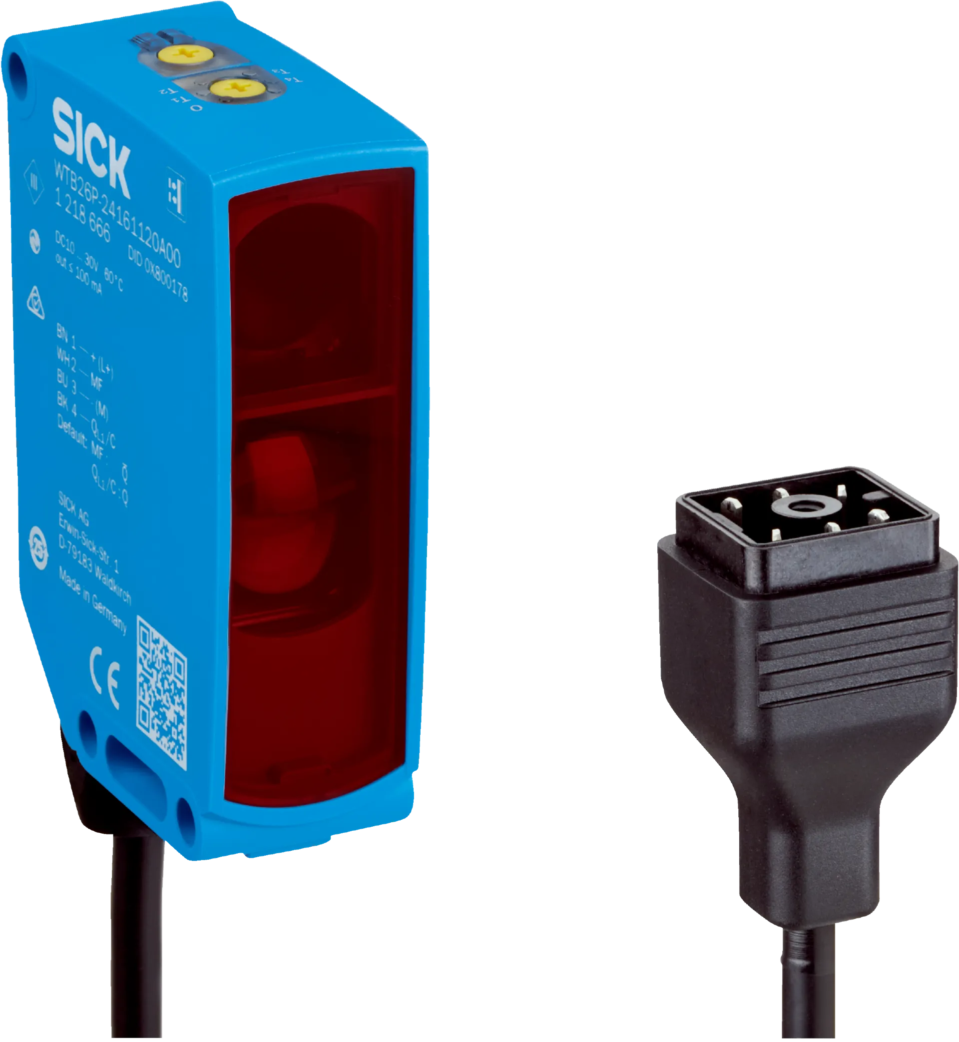 Photoelectric sensors | W26 | WTB26I-39422122ZZZ | Sensing range min. / max.: 30 mm / 2,000 mm | Functional principle: Photoelectric proximity sensor | Functional principle detail: Background suppression | Switching output: Push-pull: PNP/NPN | Switching mode: Light/dark switching | Connection type: Cable with Q6 male connector, 6-pin, DC-coded, 298 mm | Light source: LED | Type of light: Infrared light | Housing material: VISTAL® | Adjustment: Teach-in button, Potentiometer, Teach-Turn adjustment | Housing: Rectangular