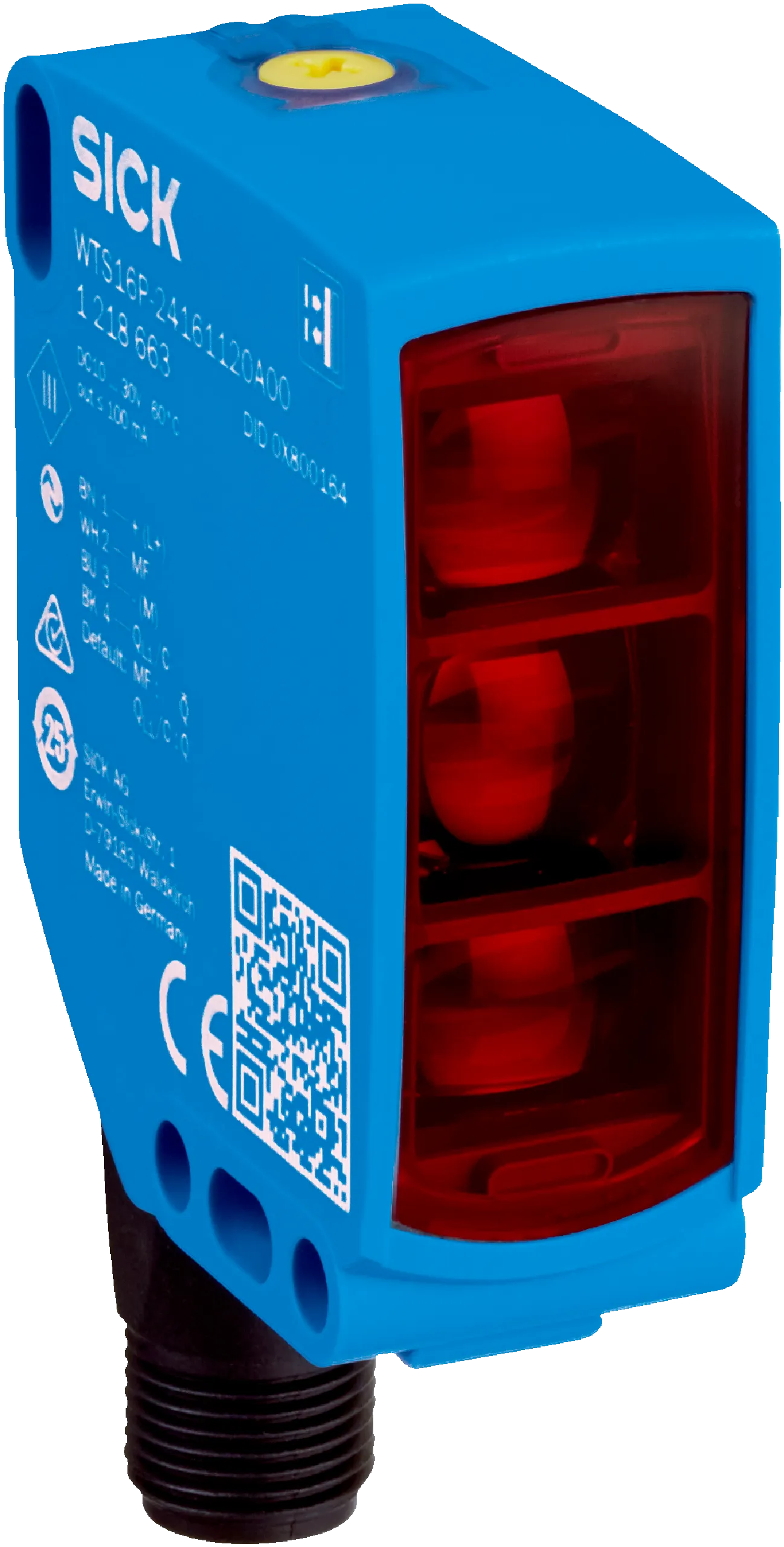 Photoelectric sensors | W16 | WTS16P-24161120A00 | Sensing range min. / max.: 10 mm / 750 mm | Functional principle: Photoelectric proximity sensor | Functional principle detail: Background suppression, TwinEye technology | Switching output: Push-pull: PNP/NPN | Switching mode: Light/dark switching | Connection type: Male connector M12, 4-pin | Light source: PinPoint LED | Type of light: Visible red light | Housing material: VISTAL® | Adjustment: Teach-in button, IO-Link, Potentiometer, Teach-Turn adjustment | Communication interface: IO-Link V1.1 | Smart Sensor: Enhanced Sensing, efficient communication, Smart Task | Smart Task name: Base logics | Housing: Rectangular