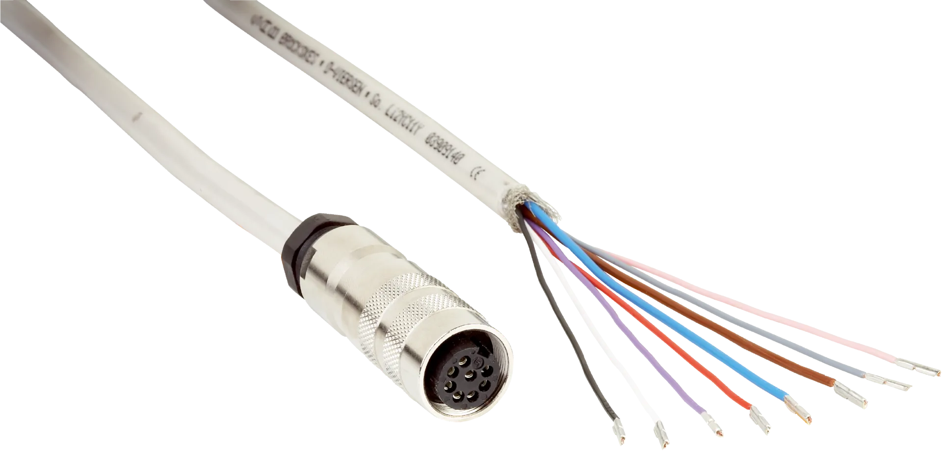 Connectors and cables | Other connectors and cables | YF2Z18-500XXXXLEBX | Connection type head A: Female connector, M16, 8-pin, straight | Connection type head B: Flying leads | Cable: 50 m, PUR, halogen-free | Description: Shielded