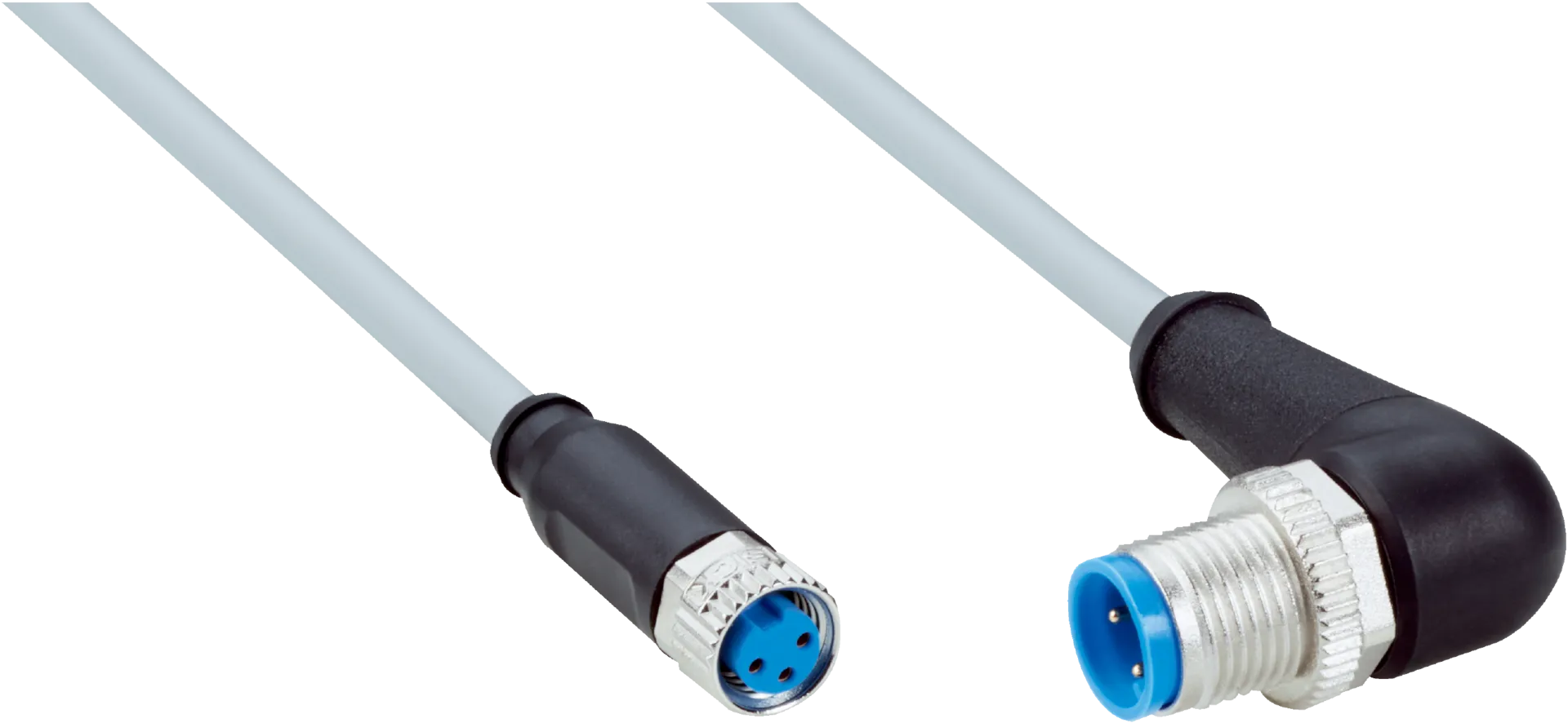 Connectors and cables | Sensor-actuator cables | YF8U13-020VA1N2A13 | Connection type head A: Female connector, M8, 3-pin, straight, A-coded | Connection type head B: Male connector, M12, 3-pin, angled, A-coded | Signal type: Sensor/actuator cable | Cable: 2 m, 3-wire, PVC | Description: Sensor/actuator cable, unshielded | Application: Zones with chemicals, Uncontaminated zones