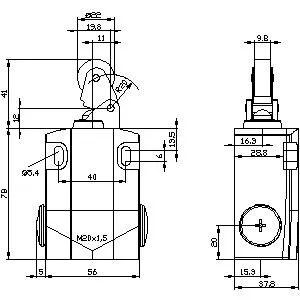 Position switch Metal enclosure 56 mm wide Device connection 3x (M20x 1.5) 1 NO/1 NC quick action contacts Roller lever made of metal and stainless steel roller 22 mm