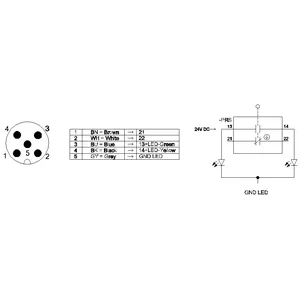 Position switch Plastic enclosure, 31 mm according to EN 50047 1 NO/1 NC quick action contacts with M12 connector, 5-pole, fixed 2x LED yellow/green 24 V DC Teflon plunger Pin assignment: Pin1=21, Pin2=22 Pin3=13 and LED green, Pin4=14 and LED yellow, Pin5=ground LED