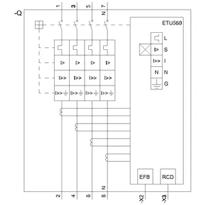 circuit breaker 3VA2 IEC Frame 100 breaking capacity class C Icu=110 kA @ 415 V 4-pole, line protection ETU560, LSIG, In=100 A overload protection Ir=40 A…100 A short-circuit protection Isd=0.6..10x In, Ii=1.5..12x In neutral conductor protection adjustable (OFF, up to 100%) ground-fault protection, can be switched off Ig=0.2…1 x In= tg=0.05-0.8s terminal connection