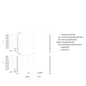 SIMATIC S7-1500, digital output module, DQ16xDC 24V/0.5A BA, 16 channels in groups of 8, 4 A per group; the module supports the safety-oriented shutdown of load groups up to SIL2 according to EN IEC 62061:2021 and Category 3 / PL d according to EN ISO 13849-1:2015. delivery incl. front connector push-in