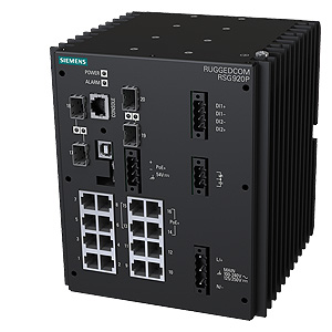 RUGGEDCOM RSG920P is a fully managed Ethernet switch with 128-bit Encryption and 20 non-blocking Gigabit Ethernet ports; support for 4 SFP modules and 4 PoE ports; -40 °C to +85 °C operating temperature (fanless)